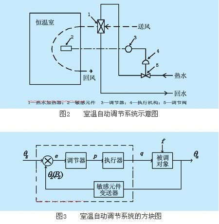 图2为一室温的自动控制系统。它是由恒温室、热水加热器、传感器、调节器、执行器机构和(调节阀)调节机构组成。其中恒温室和热水加热器组成调节对象(简称对象),所谓调节对象是指被调参数按照给定的规律变化的房间、设备、器械、容器等。图2所示的室温自动调节系统也可以用图3所示的方块图来表示。室温就是室内要求的温度参数,在自动调节系统中称为被调参数(或被调量),用θa表示。在室温调节系统中,被调参数就是对象的输出信号。被调参数规定的数值称为给定值(或设定值),用θg表示。室外温度的变化,室内热源的变化,加热器送风温度的变化,以及热水温度的变化等,都会使室内温度发生变化,从而室内温度的实际值与给定值之间产生偏差。这些引起室内温度偏差的外界因素,在调节系统中称为干扰(或称为扰动),用f表示。在该系统中,导致室温变化的另一个因素是加热器内热水流量的变化,这一变化往往是热水温度或热水流量的变化引起的,热水流量的变化是由于控制系统的执行机构—调节阀的开度变化所引起的,是自动调节系统用于补偿干扰的作用使被调量保持在给定值上的调节参数,或称调节量q。调节量q和干扰f对对象的作用方向是相反的。