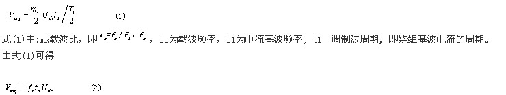 由pwm死区时间产生的基本原理可知[1],引起的逆变器输出电压的偏差脉冲在绕组电流周期t1内的电压偏差可用一方波来等效,为了分析方便,假定电压偏差脉冲在时间上是等间距的,则等效方波的高度为: