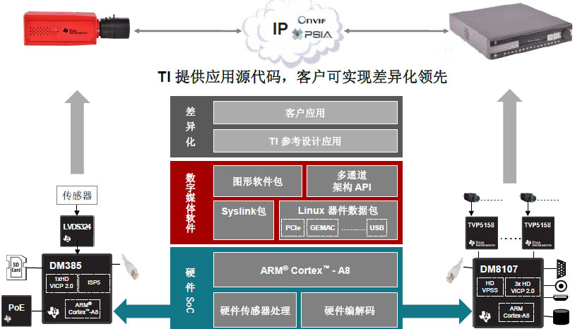 DM385和DM8107虽然是两个不同方向的产品,但底层核心技术和IP都是一样的,可以允许在中间软件层面有更好的兼容性,在最高的应用层软件上客户可以有一些差异化的产品。正因为IPNC和DVR/NVR采用相同的软件框架,所以如果客户在DVR上开发了软件产品,在开发IPNC和其他DVR产品时就可以复用,节省大量的开发时间。