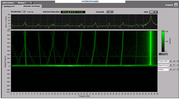 SDMS可以对水听器和加速度计原始数据进行FFT分析。对于水听器信号,原始数据将根据应用频谱分析来完成实时自身噪音计算、一个瀑布图,以及1/3倍频程图形显示的时频频谱关系。同样的,系统会持续对每一个传感器进行加速度计FFT计算。