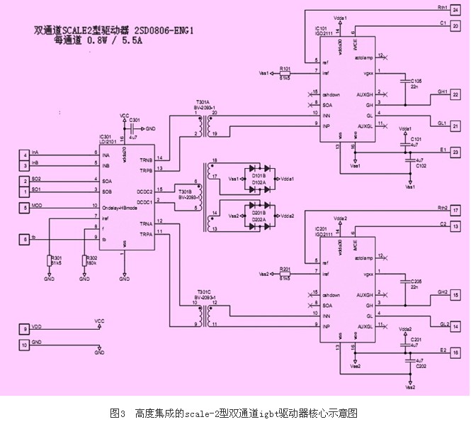scale-2芯片组是专门为适应当今igbt与功率mosfet栅驱动器的功能需求而设计的。这些需求包括:可扩展的分离式开通与关断门级电流通路;功率半导体器件在关断时的输出电压可以为有源箝位提供支持;多电平变换器与并联功率器件的专业控制功能的兼容性;可以选择使用低成本的双向信号的变压器接口或抗电磁干扰光纤接口;可扩展设置,并具备故障管理;次级故障信号输入/输出,3.3v到15v的逻辑兼容性。