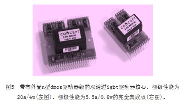 图5(右)所示为一个相似的双通道栅驱动器核心,它的驱动能力为5.5 a, 0.8 w, +15 v/-10v,栅驱动器和dc-dc变换器输出级都是完全集成的。典型的延迟时间为88ns。体积小,更容易扩展到7通道以及其低廉的成本使得它成为驱动1700 v/225a igbt的最佳选择。代表性的应用包括对于1700v / 100 a,开关频率达到25 khz,或者是600 v / 50 a,开关频率达到75 khz的igbt进行半桥式控制。