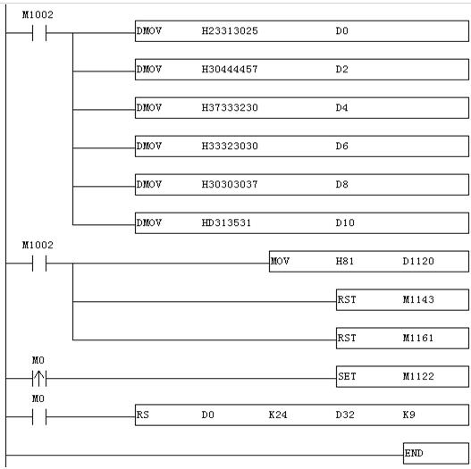 在PLC中,无协议通讯也是从低位开始发送数据的,可选用8位模式和16位模式传送,不同就在于发送数据寄存器中的8位数据还是16位数据,在这里以16位模式做说明。梯形图如下:把格式码数据253031235744443030323337303032333745463130520D按照从低位到高位的顺序依次存入到D0~D11中去,占用12个连续的数据寄存器,就是说有24个字节的数据。设定通讯参数9600,N,8,1,ASCII方式,16位模式。当M0接通一次,就可以发送一次数据,写一次频率。