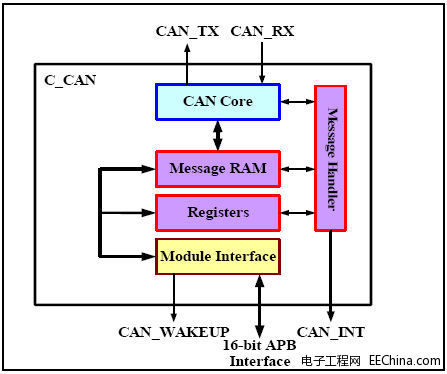 图4为NuMicro MCU内部CAN模块的内部架构,主要包含CAN Core、Message RAM、Module Interface和Message Handler四个部分,其中CAN Core负责错误侦测与处里,是CAN的主要核心;Message RAM为传送与接收的缓冲器;Module Interface为与CAN Core与CPU沟通的主要接口。Message Handler则为传送与接收命令控制中枢。