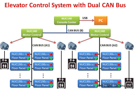 在此选用具有两组CAN Bus信道的NUC240做为电梯系统主要的运算处理与马达控制器,其一信道为连接两栋电梯大楼间的CANBus;另一信道(B)则连接至另一电梯控制器以及中控室的部分。最后中控室可透过USB方式与PC端连接,做为显示监控接口或除错处里。
