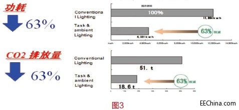 通过这个智能控制系统去控制环境与任务照明之后,比之前节省了63%的功耗,以及减少了63%的CO2排放量。