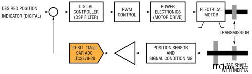 对于在混合模式控制系统中使用的 ADC 来说,延迟是一项重要的参数,因为过多的延迟有可能导致不稳定性。虽然市面上有线性度达 ppm 级的 ΔΣ ADC 销售,但它们只能在具有低调节带宽的非常低速之控制系统中使用。LTC2378-20 的无周期延迟特性与其卓越的线性度相结合,可造就速度快得多且高度准确的成本效益型混合模式控制系统实现方案。控制系统的调节带宽与其噪声带宽有关,而且它只是影响控制系统整体噪声之 ADC 噪声的带内部分。LTC2378-20 可提供 104dB SNR,在 1Msps 的采样速率下,这意味着其 22.5µVrms 的输入参考噪声对应一个仅 31.5nV/√Hz 的噪声功率频谱密度 (PSD)。相应地,当应用于一个具 10kHz 调节带宽的 1Msps 控制系统时,带内噪声仅为 31.5nV/√Hz * √10kHz = 3.2µV,对应于一个 121dB 的动态范围。在该例中,3.2µV 的噪声分辨率与由非线性引起的不确定性 (仅为 ±0.5ppm*10V = ±5µV) 大致相同。控制系统实际上在 1Msps/(2*10kHz) = 50 个样本上进行噪声平均运算,以实现 ppm 级的噪声和线性性能。不管平均运算是采用一个数字滤波器 (控制器) 来完成、抑或是采用某个用于限制带宽的模拟系统组件来完成,都不会对性能造成影响。图 3 示出了一个混合模式控制系统,其中的带宽部分地受限于飞轮的惯性。