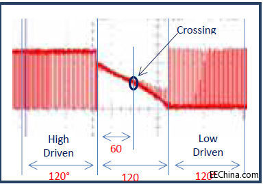 逆电动势是指永久磁铁在定子绕组中产生的电压。电机转子旋转时会出现这种情况。共有三个可用于控制和反馈信号的主要逆电动势特征。第一,适用于电机速度的逆电动势等级。因此,设计师使用工作电压至少为标准电压的2倍的MOSFET驱动器。第二,逆电动势信号的斜率随速度增加而增加。第三亦即最后者,如图8所示的“交叉事件”中逆电动势信号是对称的。精确检测交叉事件是执行逆电动势算法的关键。逆电动势模拟信号可使用高压运算放大器和模拟数字转换器(广泛应用于最现代的微控制器)按每个混合信号电路转化至MCU。每个至少需要一个ADC。