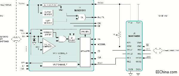 图3:数字输入子系统参考设计框图。图中U1为MAX31911八通道电平转换器/串行器,U3为MAX14850 6通道数据隔离器。