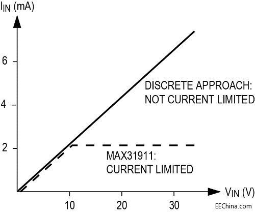 图4:传统设计方案与Corona (MAX31911)设计方案中单路输入通道的电流-电压关系比较。