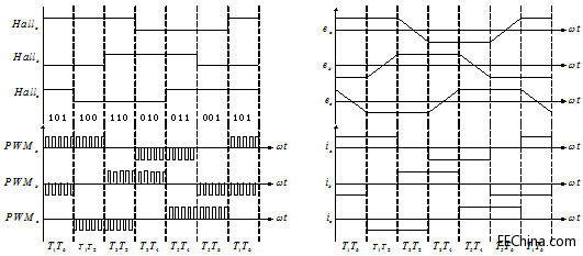 图: Hall状态与PWM、三相反电动势、三相电流的对应关系