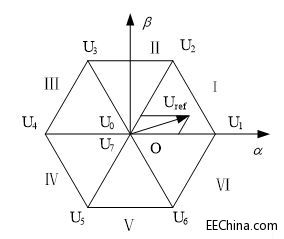 三相全桥逆变器共8种开关模式,分别对应八个基本电压空间矢量U0~U7,U0和U7为零矢量,位于原点。其余6个非零矢量幅值相同,相邻矢量间隔60°。根据非零矢量所在位置将空间划分为六个扇区。空间矢量脉宽调制就是利用U0~U7的不同组合,组成幅值相同、相位不同的参考电压矢量Uref,从而使矢量轨迹尽可能逼近基准圆。