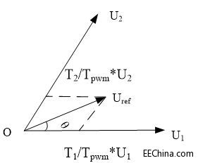 图9为参考电压在第一扇区,有两个非零矢量U1U2和零矢量合成,当参考电压进入下一个扇区,采用新的相邻两个矢量与零矢量进行合成。基于矢量合成规则,在符合T1+T2 <= Tpwm条件下,并要求任意角度下V1和V2都能合成出的矢量,所以Uref_max=√3/2 Udc。调制度M=Uref/(Uref_max)=Uref/(√3/2 Udc)