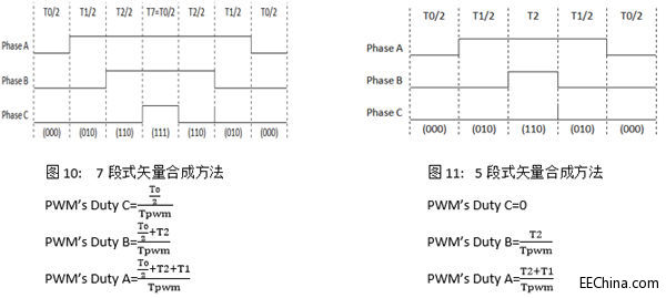 对比7段式和5段式可知,两者在零矢量的分配上存在很大的区别,单个PWM周期内,5段式方法将零矢量集中插入在中间,转矩脉动大,在低频时会导致明显的走走停停不平稳现象,而7段式方法中零矢量的一半被插入在PWM周期的中间,另一半插入在PWM周期的两边,这样可以使得磁链的运转更加平稳,减少电机转矩的脉动,使得低频时特性明显好于5段式,高频时特性差异不大。但5段式方法中每个PWM周期中,总有一相桥臂的开关管状态不需要改变,而在7段式方法中,每一相桥臂的开关管都需要开关各一次,5段式比7段式开关次数减少1/3,所以5段式的开关功耗是最小的。综合来说在PWM周期达到10KHz以上,5段式更加合适。