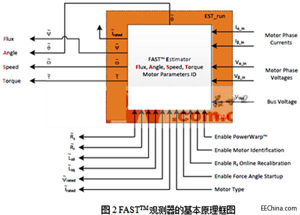 在一些比较苛刻或者需要很低成本的工业场合,往往无法安装编码器,这时无速度传感器的方案是唯一选择;但是其原理往往比较复杂,并且很难在低速的情况下取得理想的性能。FASTTM技术为用户解决了这一难题。它需要无速度传感器根据电机的电流、电压和逆变器直流母线的电压,根据一定的数学关系来观测无速度传感器条件下磁场定向所需要的关键变量的值,包括磁链、FOC定向角、转速、转矩等。具体使用的数学关系目前并没有开发,这应该算是TI的核心技术或者商业机密,但是这并妨碍我们使用它,并理解其工作方法。其原理框图图2 所示。
