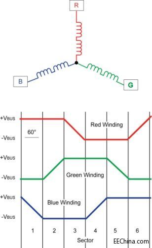 依靠传感器的运行实现起来非常容易,但除去传感器可降低系统成本并提高可靠性。为了理解无传感器算法如何计算转子位置,我们进一步了解一下BLDC电机的三个相。