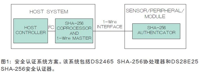 实现安全认证系统需要用传感器/外设模块连接主机系统,图1所示的系统由1-Wire SHA-256安全认证器和具有1-Wire主机功能的SHA-256协处理器组成。主机和外设之间的工作通过1-Wire接口单个引脚实现,降低互联的复杂度,简化设计,并降低成本。