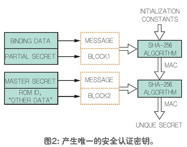 乍一看, 似乎没有办法达到这些目标。但我们采用了一个简单的解决途径,即利用一些“数据源”计算密钥,然后在受信任/受控制的生产环境下将其安装到器件内部。用于计算安全认证密钥的数据源包括:主密钥、绑定数据、分密钥、安全认证器的ROM ID,以及填充符/格式化符号(“其它数据”),过程如图2所示。尽管数据源在某个时间点是公开的,例如在受信任的生产环境,但计算得到的密钥永远不会暴露,始终是隐蔽的。