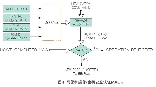 合法主机重建安全认证器的密钥,能够生成有效的写保护MAC。接收到来自主机的MAC时,安全认证器将其与自身的计算结果进行比较。只有两个MAC相匹配时,才允许将数据写入EEPROM。即使MAC正确,也不能更改受写保护的用户存储区域(图4)。