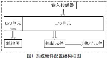 系统的硬件配置结构框图如图1所示,包括CPU单元、输入(光电位置开关和贴胶有无检测传感器)、操作面板(触摸屏和指示灯)、控制元件(伺服驱动器和电磁阀)、执行部件(伺服电机、直流电机、气缸)等几部分组成。取电芯电机设置左限位、右限位和原点;拉胶气缸、切胶气缸和贴胶气缸各有两个光电位置开关用来检测气缸是否到位;贴胶有无检测传感器检测每次贴胶的胶带是否贴在电芯上。触摸屏作为设备控制的操作界面,接受来自操作人员的操作指令并指示设备的运行状态,PLC和触摸屏之间通过RS232通信电缆进行通信。取电芯电机采用伺服电机,通过伺服驱动器控制;下料电机采用直流电机;电磁阀采用两位五通的电磁阀来控制气缸的进退。