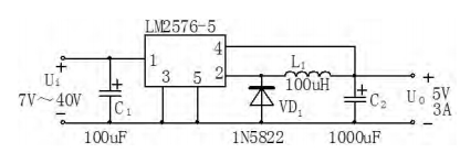 输出电压U0经过LM2756~5的电压反馈输入端送入与基准电压比较,脉冲控制电路根据比较结果产生可控的脉冲信号控制开关管VT的导通与截止,通过电感L的储能,经电容C滤波后得到稳定的输出电压U0,二极管VD在开关管VT截止时为电感L提供了续流通路。