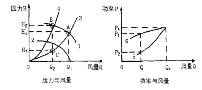 曲线5为变频控制方式下的p-Q曲线,曲线6为风门调节方式下的p-Q曲线。可以看出,在相同的风量下,变频控制方式比风门调节方式能耗更小,二者之差可由下述经验公式[}n]表示:ΔP=[0.4+0.6Q/Qe-(Q/Qe)3]Pe