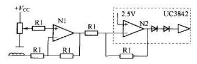 斜坡补偿可以用图5所示电路来实现。一般R1的阻值预先设定,再计算R2的阻值,很重要的一点是R2的阻值应足够高,以避免使振荡器产生振荡频率漂移。