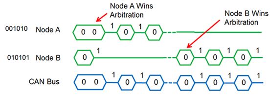 传播延迟会影响节点间的并发传输和仲裁。 冲裁依赖于CAN信号发送;逻辑0表示“主动”(总线间的差分电压),逻辑1表示“被动”(全部输出为高阻抗),意味着主动位将覆盖被动位。 发射时,所有节点监控总线;而发射被动位时则停止,从而允许另一个节点赢得仲裁(图1中的节点A)。