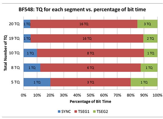 下一步是定义位段,并将采样点设得尽可能晚。 对于表1中的每一个有效选项,SYNC段必须允许有一个TQ,并且TSEG2 (PS2)段必须适应CAN控制器处理时间(只要BRP大于4,BF548就要低于1 TQ)。 TSEG1 (PROP + PS1)为16 TQ(最大值)。