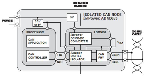 图4. 采用ADM3053的隔离式CAN节点,集成isoPower
