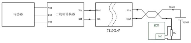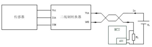 两线制转换器的功能是将两线制回路的电压Vin转换成传感器的供电电压Vcc,同时根据传感器的输入信号Sin控制两线制回路Vin的负载电流Is。这里Is就是两线制电路传输的4~20mA电流信号。