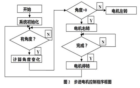 本设计采用的是对步距角进行8细分。每发出一个脉冲,电机走一步,转过的角度为1.8°/8,即0.225°,电机转一圈需要1600个脉冲。步进电机的方向由ARM的一个IO口控制,并且利用两个发光二极管来表示其正反转。电机方向控制分3种方式:左转、右转和自锁。当偏差≤0.003,即角度变化不到0.225°,步进不到一步时,控制步进电机处于自锁状态;当偏差>0.003时,电机右转;当偏差<0.003时,电机左转。