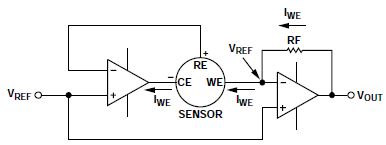 放大器U2-A从CE引脚吸取足够的电流,以便在传感器的WE和RE引脚间保持0 V电位。RE引脚连接到U2-A的反相输入;因此其中无电流流动。这意味着电流从WE引脚流出,随气体浓度呈现线性变化。跨阻放大器U2-B将传感器电流转换为与气体浓度成正比的电压。