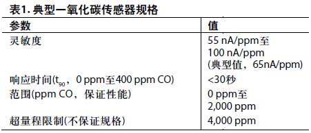 此电路笔记选择的传感器是Alphasense CO-AX一氧化碳传感器。表1显示与此常见类型的一氧化碳传感器相关的典型规格。