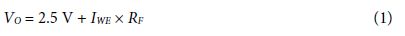 图2显示电化学传感器测量电路的原理示意图。电化学传感器的工作原理是允许气体通过薄膜扩散到传感器内,并与工作电极(WE)相互作用。传感器参考电极(RE)提供反馈,以便通过改变反电极(CE)上的电压保持WE引脚的恒定电位。WE引脚上的电流方向取决于发生的反应是氧化还是还原。在一氧化碳情况下发生的是氧化;因此,电流会流入工作电极,这要求反电极相对于工作电极处于负电压(通常为300 mV至400 mV)。驱动CE引脚的运算放大器相对于VREF应具有±1 V的输出电压范围,以便为不同类型的传感器(Alphasense应用笔记AAN-105-03,设计恒电位电路,Alphasense公司)提供充足裕量。