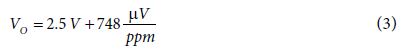 传感器使用65 nA/ppm的典型响应时,公式3显示与一氧化碳的ppm有函数关系的电路输出电压。