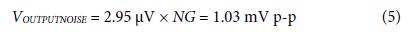 跨阻放大器的输入噪声在输出端表现为由噪声增益放大。对于本电路,我们仅关注低频噪声,因为传感器工作频率极低。ADA4505-2的0.1 Hz至10 Hz输入电压噪声为2.95 μVp-p;因此,输出端噪声为1.03 mV p-p,如公式5所示。