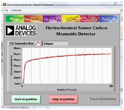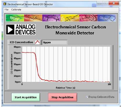 要执行系统校准,首先请确认不存在一氧化碳。要开始采集数据,请单击“Start Acquisition(开始采集)”。从“Calibrate(校准)”菜单选择“Set Zero(设置0)”。如果满意ADC读数,请单击“OK(确定)”,当前ADC读数会被存储为0点。应用校准气体,当传感器输出完全建立后,从“Calibrate(校准)”菜单中选择“Set Span(设置范围)”。输入所用校准气体的浓度,单击“OK(确定)”。如此会存储系统范围。