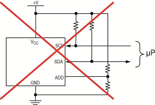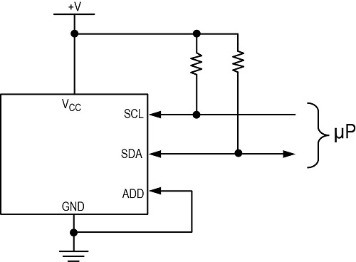 图2所示为连接至地的典型I2C地址引脚。如果ADD由电源确定,引脚应直接连接至相应的电源。(通过0Ω连接至V+或GND)。