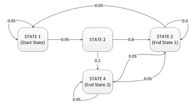 在图1中,使用马尔可夫链建模的序列预报器具有4个状态。从一个状态转换到另一个状态的可能性用小数表示。例如,从状态1转换为状态2的概率为0.95,而保持在状态1的概率为0.05。在转换时,可能会有一个或多个路径。图1中显示的序列预报器可作为有限的状态机来实现,它的最形象的表达就是格状图。