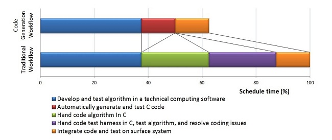 在传统的手工编码工作流程中,会用C代码重写原始科学计算算法和测试框架,并且必须对C代码进行测试和调试。在新的工作流程中,C代码会从技术计算软件中自动生成,从而节约了时间并可防止编码错误(图3)。