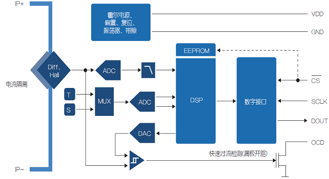 芯片处的温度(T)和机械应力(S)由第二个模数转换器不依赖初级电流进行单独测量和数字化处理。然后,DSP利用温度和应力信息来平衡“原始”电流信号。最后,经过平衡的信号通过接口单元和SPI接口输出。