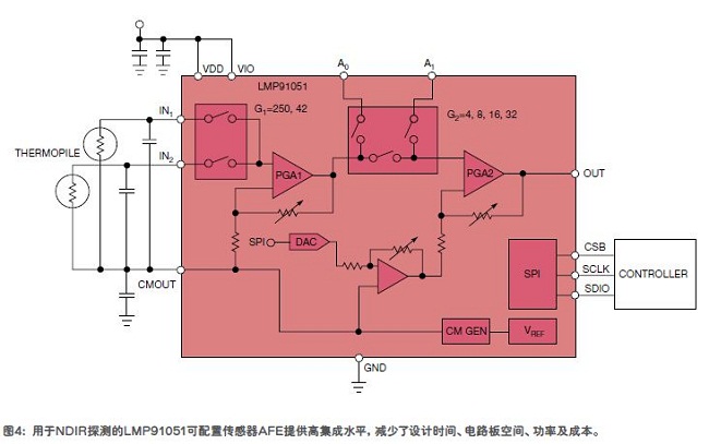 同样,NDIR系统需要一个基准通道、可调放大倍率、偏移补偿,以及偏置。LMP91051可配置传感器AFE为NDIR探测应用完成这些工作(图4)。它有一个双通道输入,支持活动通道和基准通道、PGA、可调偏移抑制DAC,以及共模发生器。LMP91051能够将这些重要的NDIR系统块集成到一起,从而减少了设计时间、电路板空间、功率,以及成本。
