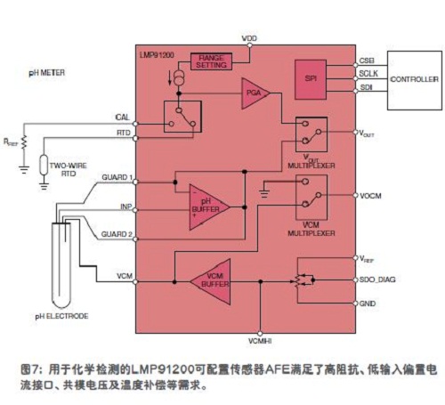 最后,pH传感器需要一个高阻、低输入偏移电流的接口、共模电压,以及温度补偿能力。用于化学探测的LMP91200传感器AFE就具备了这些功能(图7)。用它的可编程电流源就可以方便地与RTD连接。它的多步温度测量功能消除了温度信号路径中的误差,从而进一步提高了温度测量的精度。该器件的输入偏置电流在25C时只有数十fA量级,从而与高阻pH电极连接时最大限度地减少了误差。最后,当器件关断时,偏置电流只有数百fA,减少了由于拉出电流而带来的电极衰退。