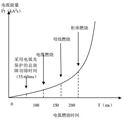 IEC298标准附录AA中规定的内部燃弧时间是100ms,目前市场上销售的开关柜基本上是按照IEC298标准生产的,也就是说,开关柜可以承受的电弧燃烧时间为100ms。由于发生弧光故障在断路器动作前,故障短路电弧是一直在燃烧的,即保护动作时间加上断路器分闸时间之和,即为电弧燃烧的持续时间。也就是说,从保护开关柜方面考虑,保护动作时间应在小于100ms切除故障以防止弧光短路故障进一步发展扩大造成更大的危害。