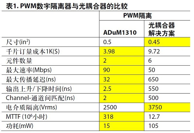 对功率级进行脉冲宽度调制,这是所有电机驱动的核心所在。开关频率范围一般为10 kHz-20 kHz。在优化控制性能时,对脉冲宽度、死区时间和通道间延迟的精密控制显得至关重要。在为PWM控制信号选择适当的隔离器件时,数字隔离器在性能和成本两个方面都要远远优于同级别的光耦合器选项(见表1中的比较)。