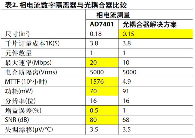 多数高级电机驱动以电机相电流为主反馈。为了提供连续的反馈,将超低电阻分流电阻与电机相位串联起来。然而,这会增加电路的复杂性,因为需要测量毫伏级的信号以及以快速dv/dt高频切换的百伏级共模电压摆幅。 对于这种设计,两个隔离的_-_调制器(即AD7401A)用来测量电机绕组电流,数字位流则由电机控制IC上的数字过滤电路进行处理。第三相电流可以基于另外两相电流以数学方法计算得到,以减少功耗、降低元件成本。AD7401A在单封装中集成了一个差分采样保持级、一个_-_调制器和数字隔离机制。高电压端模拟信号被转换成一个数字串行数据流,然后通过隔离栅传输至低电压端。AD7401A还含有一个时钟输入引脚,只需一个时钟源,即可同时对各器件进行测量。正如表2所示,市场上的确存在集成度和成本类似的光耦合器;然而,数字隔离器技术在功耗、速度和可靠性方面的表现仍然更加突出,这是与器件的基础结构相关的,更不用说AD7401A出色的调制器性能。