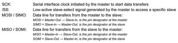 串行外设接口 (SPI) 总线是一个工作在全双工模式下的同步串行数据链路。它可用于在单个主控制器和一个或多个从设备之间交换数据。其简单的实施方案只使用四条支持数据与控制的信号线(图 1):