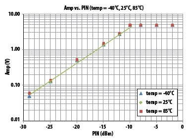 图9展示,内部ASIC的输出电压是是输入光功的函数。ASIC的输出会在输入光功大于-10dBm的情况下饱和。由于检测拉弧并不是检测接收光信号的形状,而是检测拉弧检测单元设定的阈值,光传感收发器在输入光功高于-10dBm时,仍然100%可靠地持续检测弧光事件。对于输入光功低于-10dBm的情况,ASIC的线性度做的又非常好。这个设备可以在-40℃到﹢85℃环境工作。