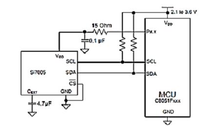 图3. Si7005低功耗操作配置,电源来自MCU端口引脚